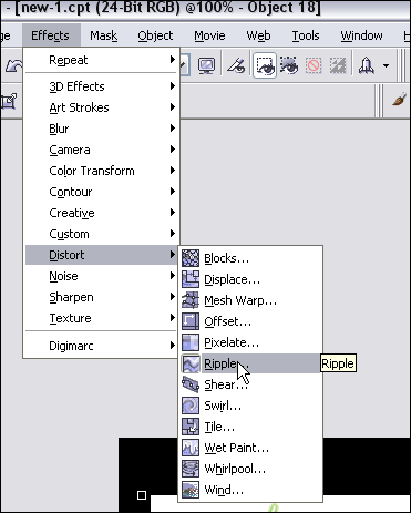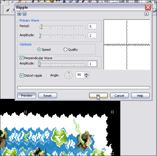 Step 4: Time to distort our text and mess around a bit. I encourage you to try using all kinds of distortion effects and not just follow what I do. You can get all kinds of great results just by trying a few random filters you’ve never played with before! I’ll start off by using the Ripple Effect.