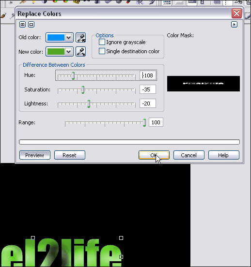 Step 3: Once you have the text the way you like it, hit copy/paste again and make a second copy of your text. Feel free to play with the Brightness and Contrast again, or in my case, I’m going to replace the colors with a green cast. You can also just adjust the hue… works quite well.