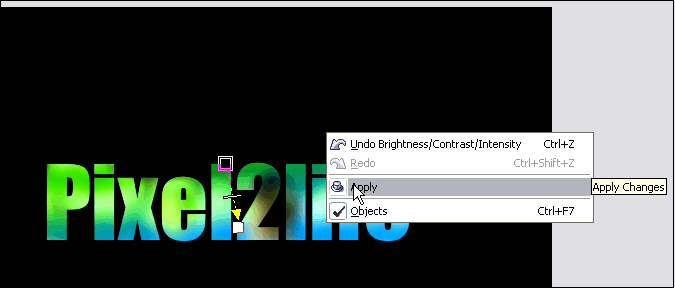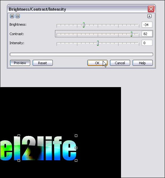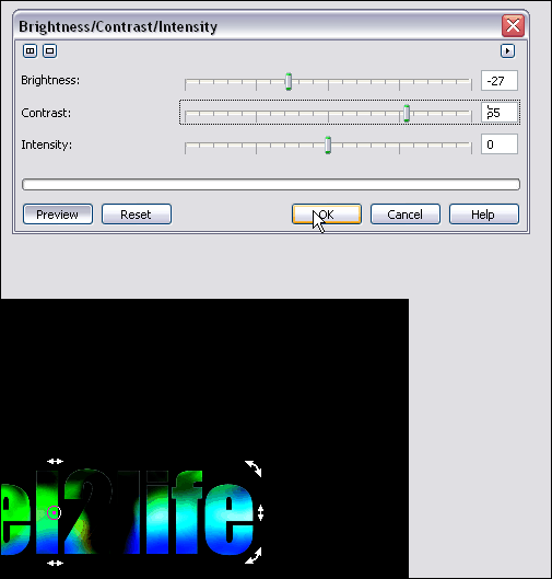Step 9: Time to play with contrasts and objects again! This is just to tweak the text a bit and get it to a level I like. I’ll start off my clicking on the text object and re-adjusting it’s contrast.