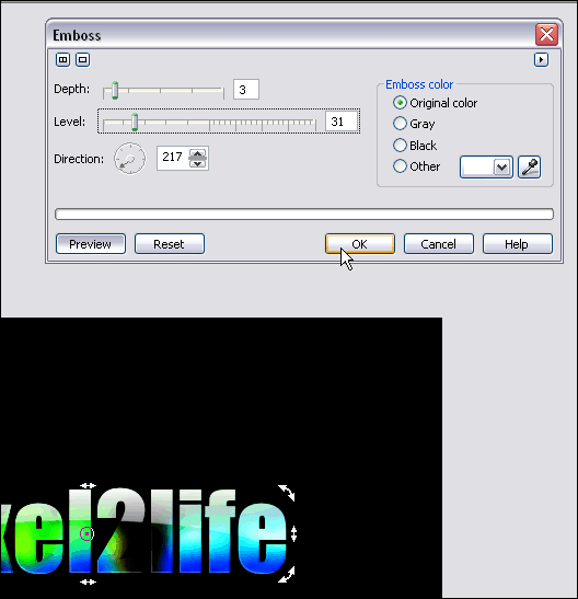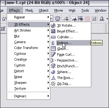 Step 1: Combine all your text objects together and delete any hidden objects you have still in the Object Docker. You should only have 3 objects at this point… the background, the text object and the shine object. Click on the text object and we’ll apply a slight emboss effect to it.