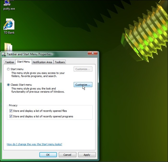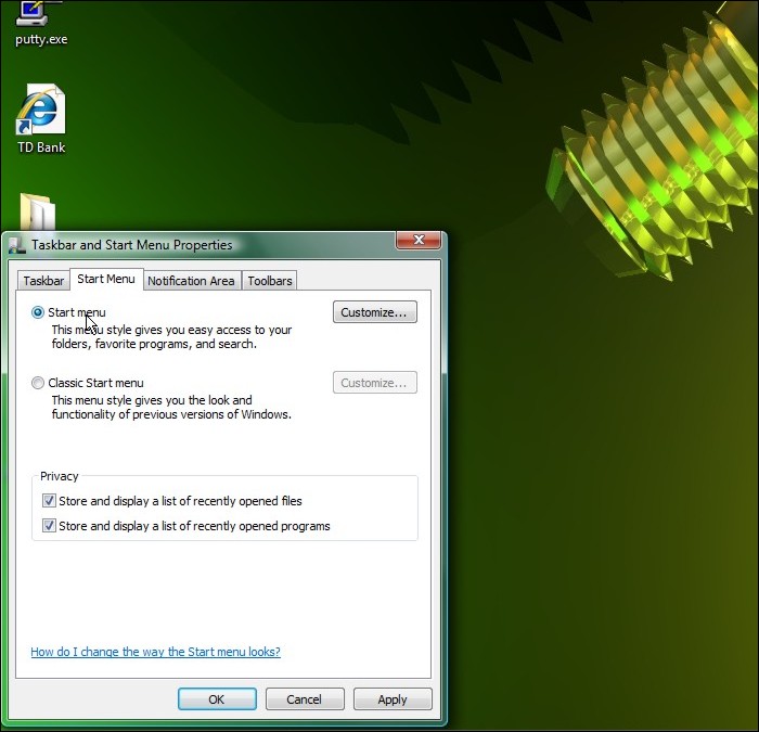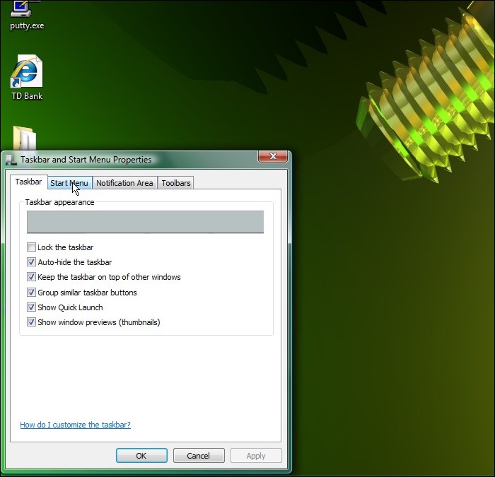 Step 2 – That will load up the Taskbar properties menu… click on the Start Menu tab to access the required settings: