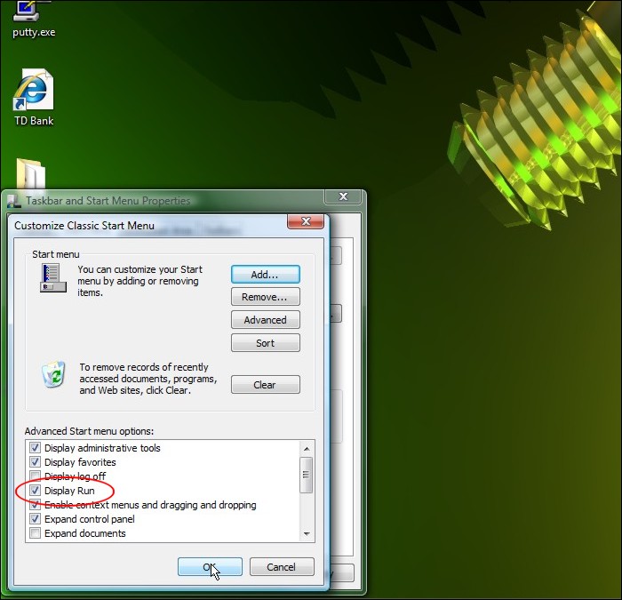 Step 5 – Here you can enable/disable various functions within the Start Menu including the Run button, which I have circled in red.  Once you’re done, click OK to return to the main menu.