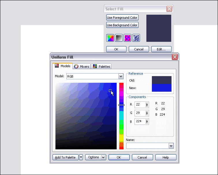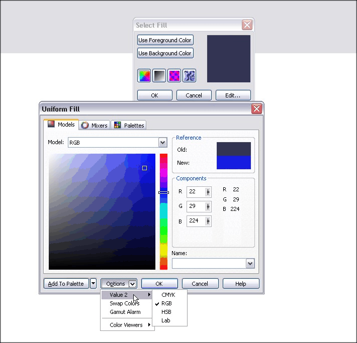 The Uniform Fill option is fairly straightforward and allows you multiple methods of selecting a solid color using various palette methods.  We’ll go over the color models, mixers and palettes.