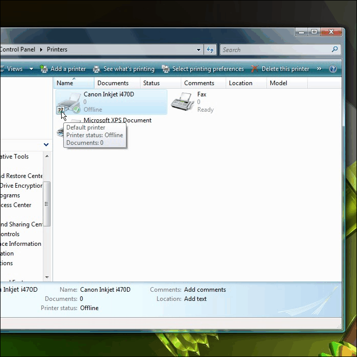 Step 1 – Click on Start > Printers to load the Printers configuration menu: