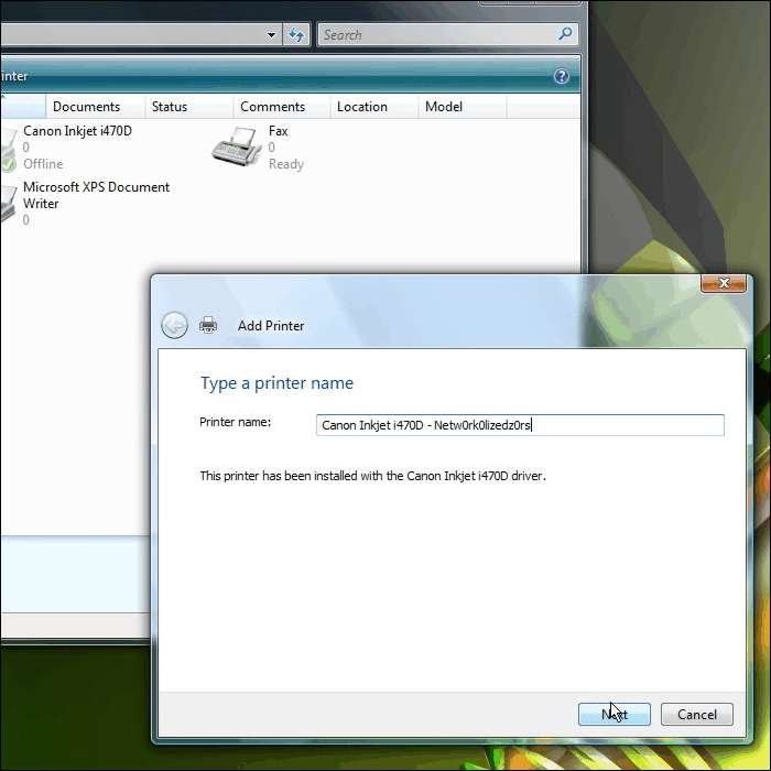 Step 3 – Name your printer to whatever you want or stick with the default and click next:
