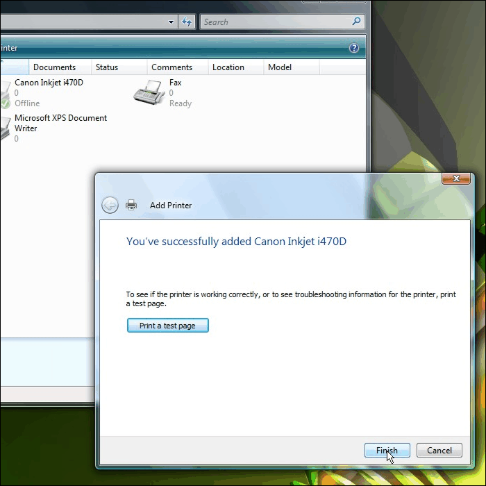 Step 4 – Click Finish and you’re done!  You can also fire off a test page just to make sure your share is set up properly: