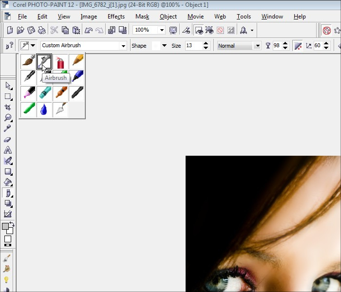 And here is the key… set the transparency to a very high 95% – 99%. This means that your brush strokes will be BARELY visible and it will take multiple strokes before the color you are airbrushing is actually visible. For this tutorial, I’m going to work with a 98% transparency. Remember, the trick is to build up the color very slowly and highlight the color that’s already there… we’re not changing the eye color, we’re enhancing it and making the color pop out.