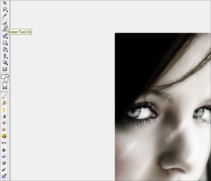 Step 4 – You can then grab your eraser tool and clean up the photo piece a bit… in this example, I cleaned up the white of the eyes and the thicker portion of the lips: