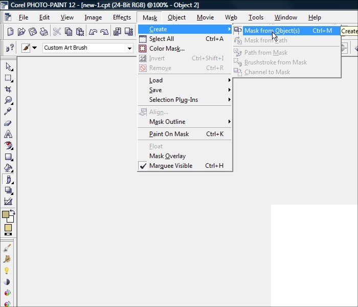 Step 5 – We only want our pen tool to apply strokes to the surface of the tape, so we need to apply a mask to the tape object we created. Simply click on Mask > Create > Mask from Object (or hit Ctrl-M) and you now have a mask around the object: