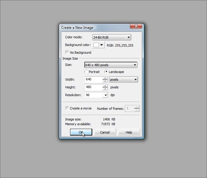 Step 1 – Let’s start off with a new canvas… Let’s go with 640 x 480 on a white background: