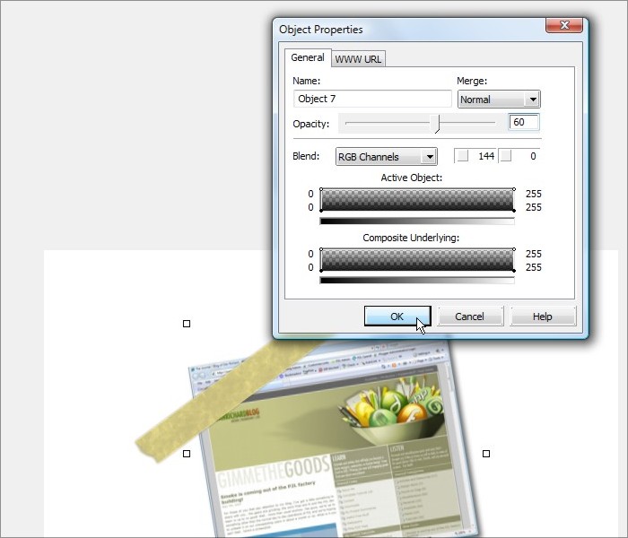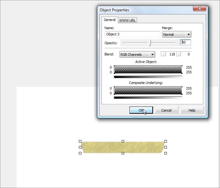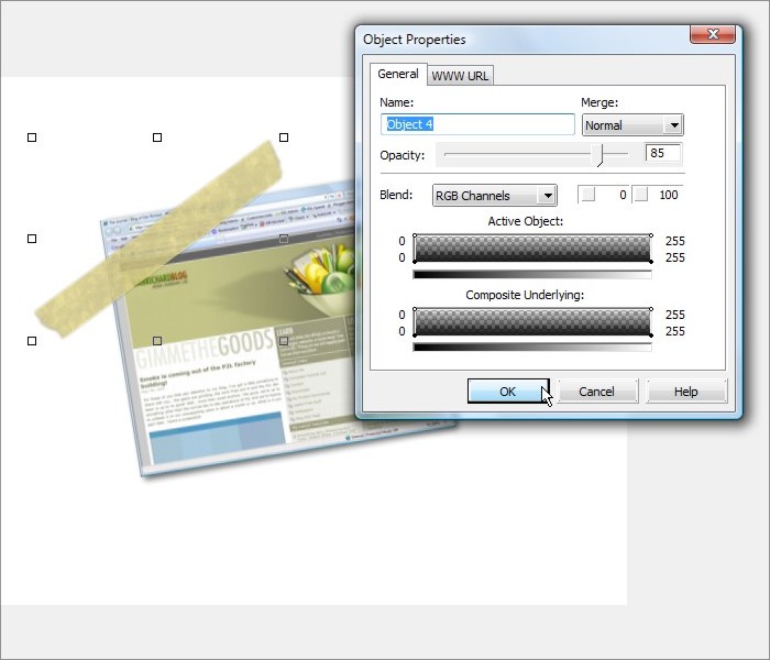 Step 28 – And for the FINAL touch of realism, we’ll make the tape SLIGHTLY transparent by clicking on the tape object, opening the properties, and setting the opacity to 85% – 90%: