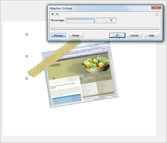 Step 21 – You may have noticed that when we rotated the tape, it got a bit bit blurry on us. No worries, we can sharpen that up again by applying an Adaptive Unsharp at around 70% – 100%: