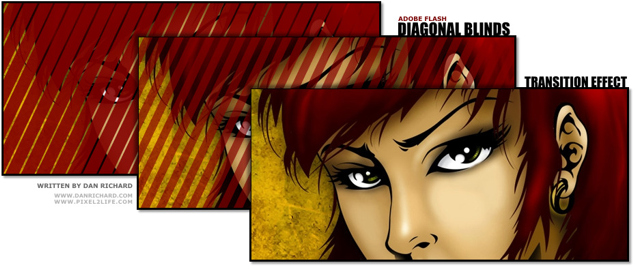 What we are going to do is create an animated transition effect where it looks like a diagonal row of blinds is opening to reveal an image below.  This can be used when loading a site banner, for buttons or as a photo gallery transition effect.  Granted I’m going to be a tad sloppy about this, but you can create some very clean versions of this by using more masks to control the overflowing lines and such.  I’ll also show you a couple of variants on this effect by adding a fade out as the blinds open.
