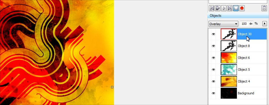 Step 16: So if we look at the object docker, Object 30 will be our “shadow” object and Object 8 is our original line shape that has the nice overlay effect.  The first thing we need to do is change Object 30’s layer style to Normal instead of Overlay, so go ahead and click on Object 30 in the docker and then set the layer style to Normal: